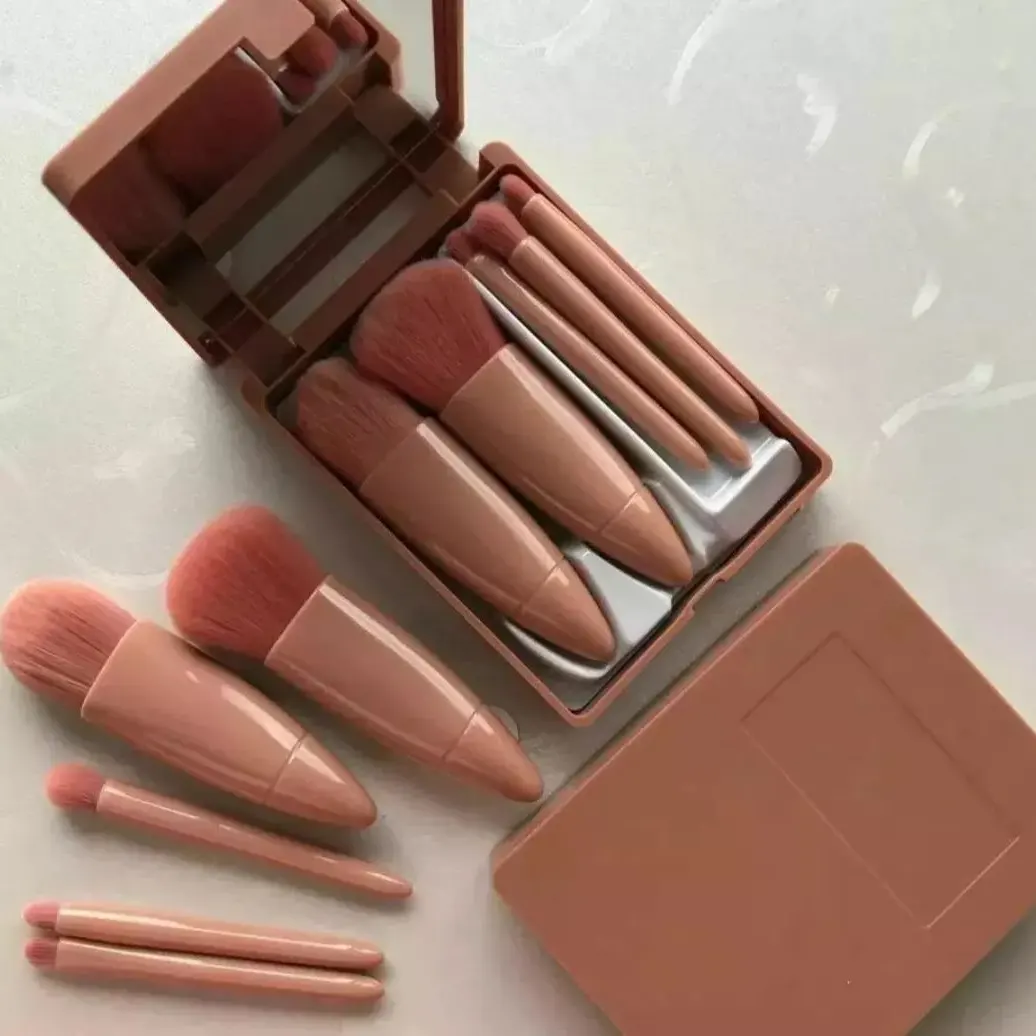 ست براش ۵ تیکه برای رژگونه،سایه،کانتورینگ،کرمپودرو...دارای جعبه و آینه ومسافرتی یکی از پرفروش ترین ست براش موجود